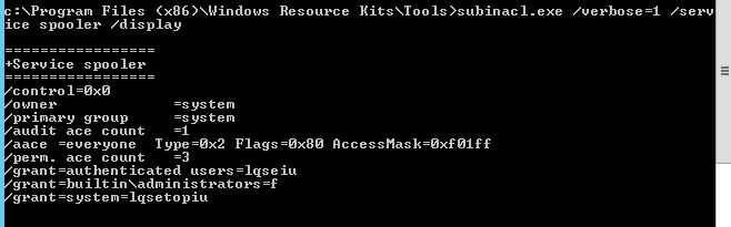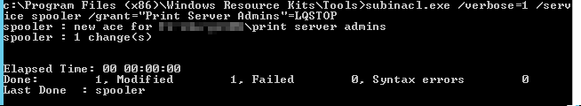 subinacl.exe /verbose=1 /service spooler /grant="Print_server_Servicedesk_Rights"=LQSTOP